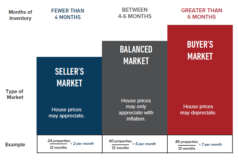 More than 6 months of inventory is considered a buyer’s market. In a buyer’s market, there is a high supply of homes available relative to the number of properties available. With more than 6 months of inventory, sellers will compete for buyers, which leads to downward pressure on prices.